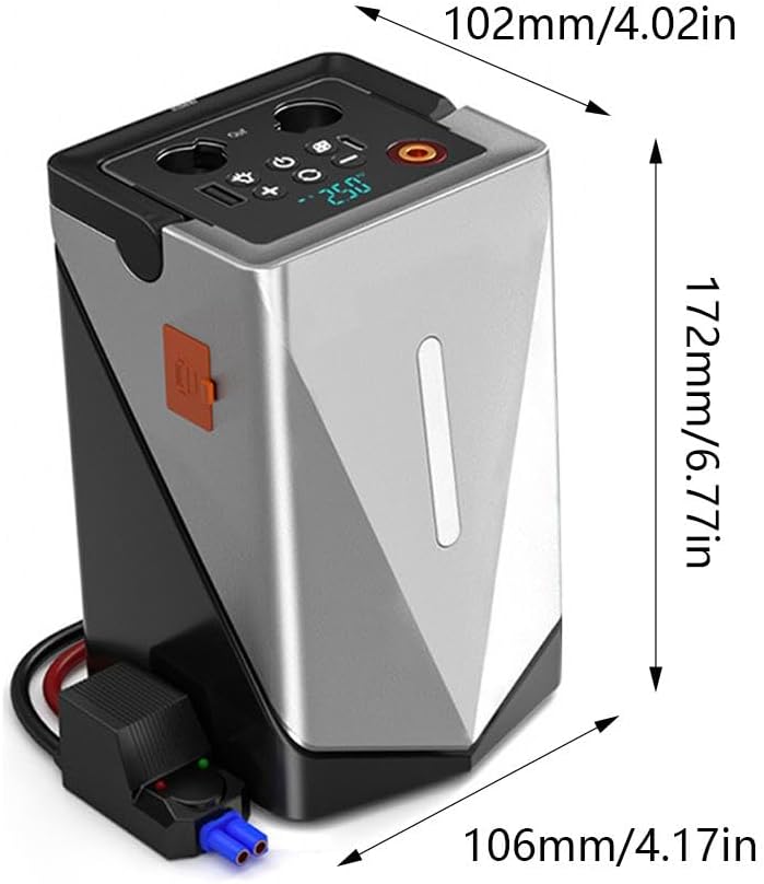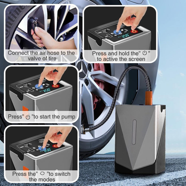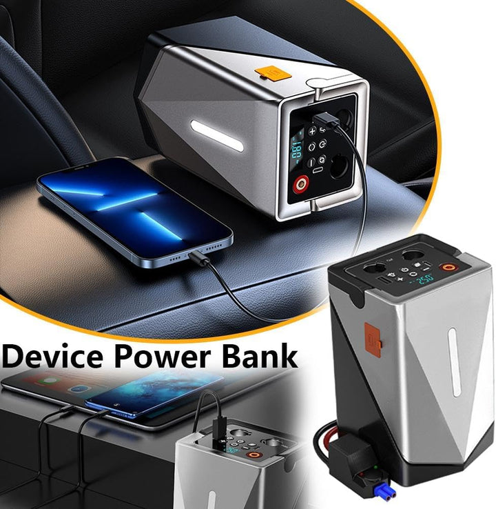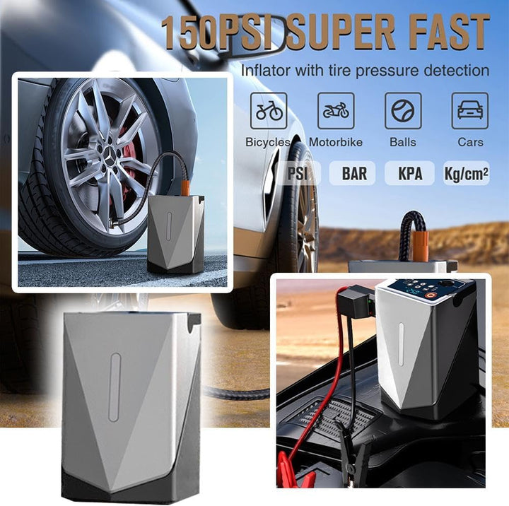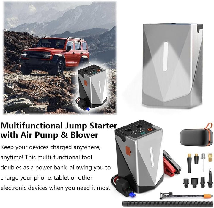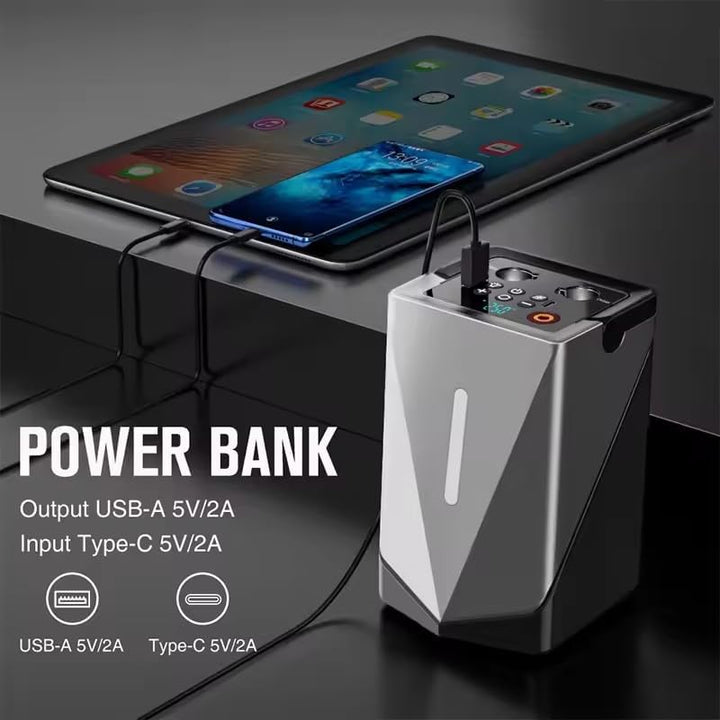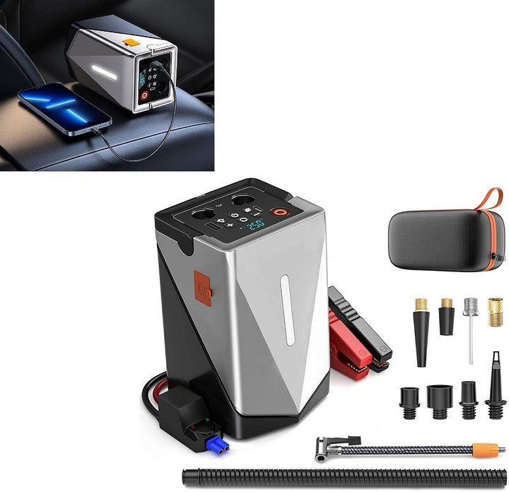جهاز طوارئ 7-في-1 يجمع بين باور بانك، منفاخ إطار بضغط 150 PSI، شاحن بطارية السيارة (Jump Starter)، كشاف LED ثلاثي الأنماط، مستشعر ضغط رقمي، منفاخ/بلور، وحقيبة إكسسوارات مدمجة. تصميمه المدمج (172 × 106 × 102 مم) يناسب درج التابلوه أو صندوق الأمتعة، ويمنحك حلاً شاملاً لكل المشكلات الشائعة على الطريق: بطارية فارغة، إطار منخفض، أجهزة محمولة بدون شحن أو الحاجة لإنارة طارئة.