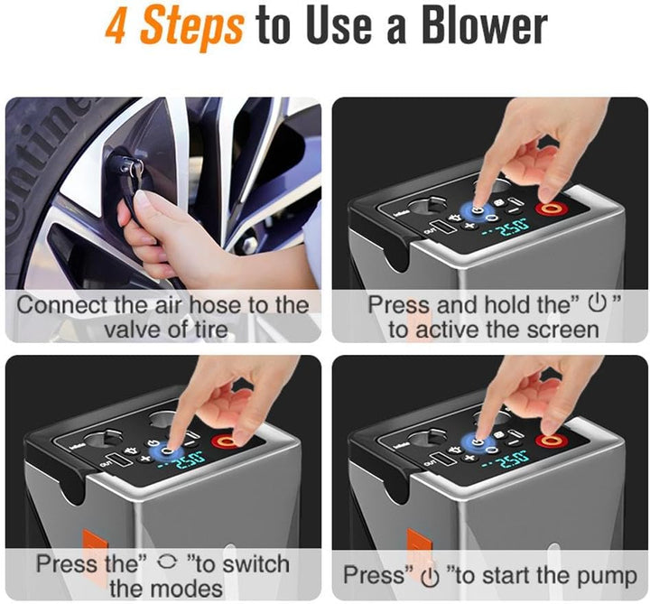 منفاخ رقمي 150 PSI: يضبط ضغط الإطار بدقة ويعمل مع السيارات، الدراجات، الدراجات النارية، الكرات والألعاب الهوائية. شاشة LCD تعرض وحدات PSI / BAR / KPA / Kg cm².